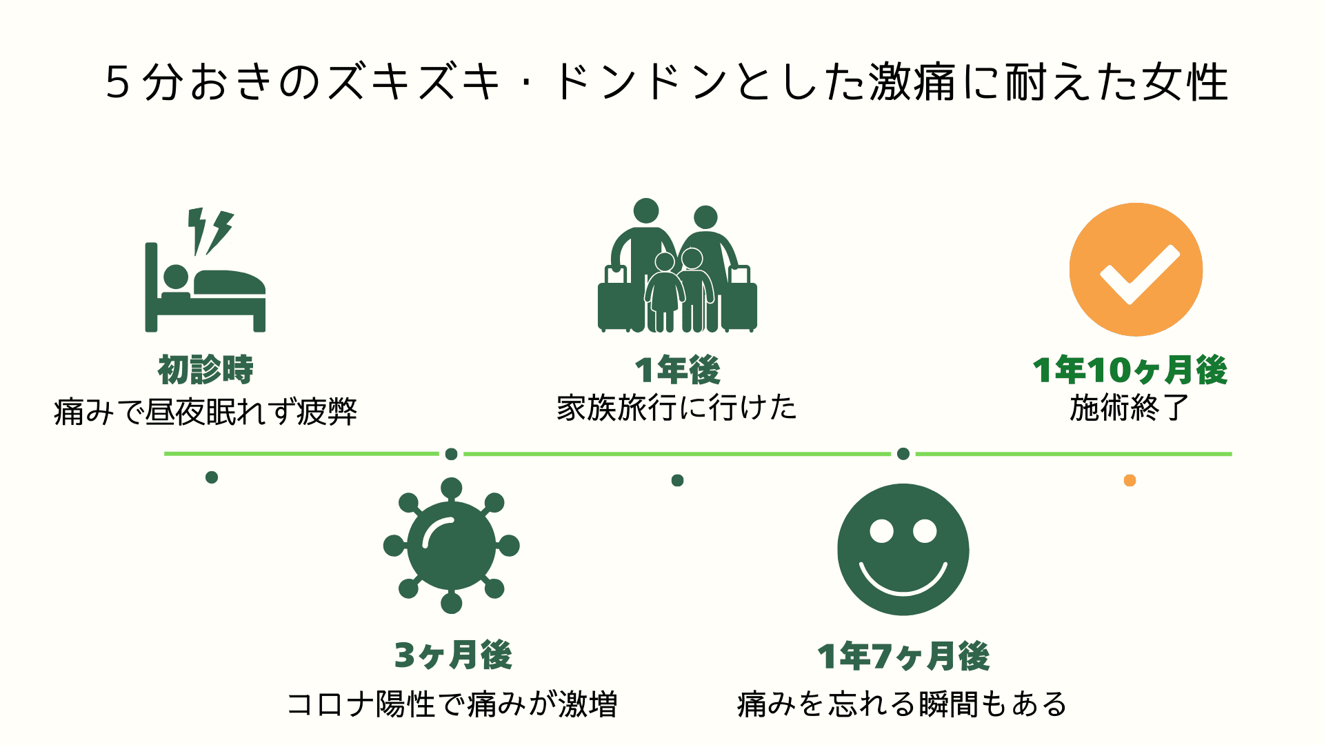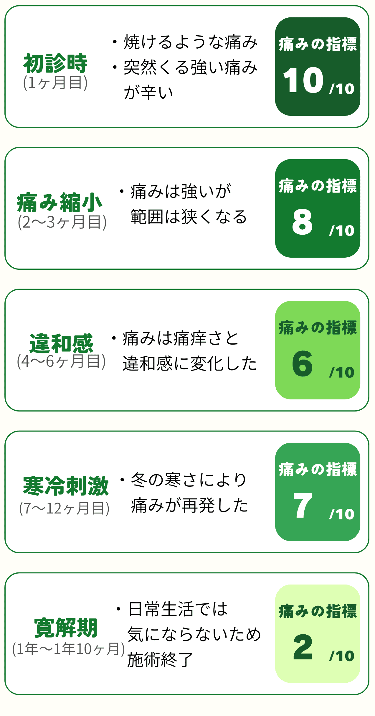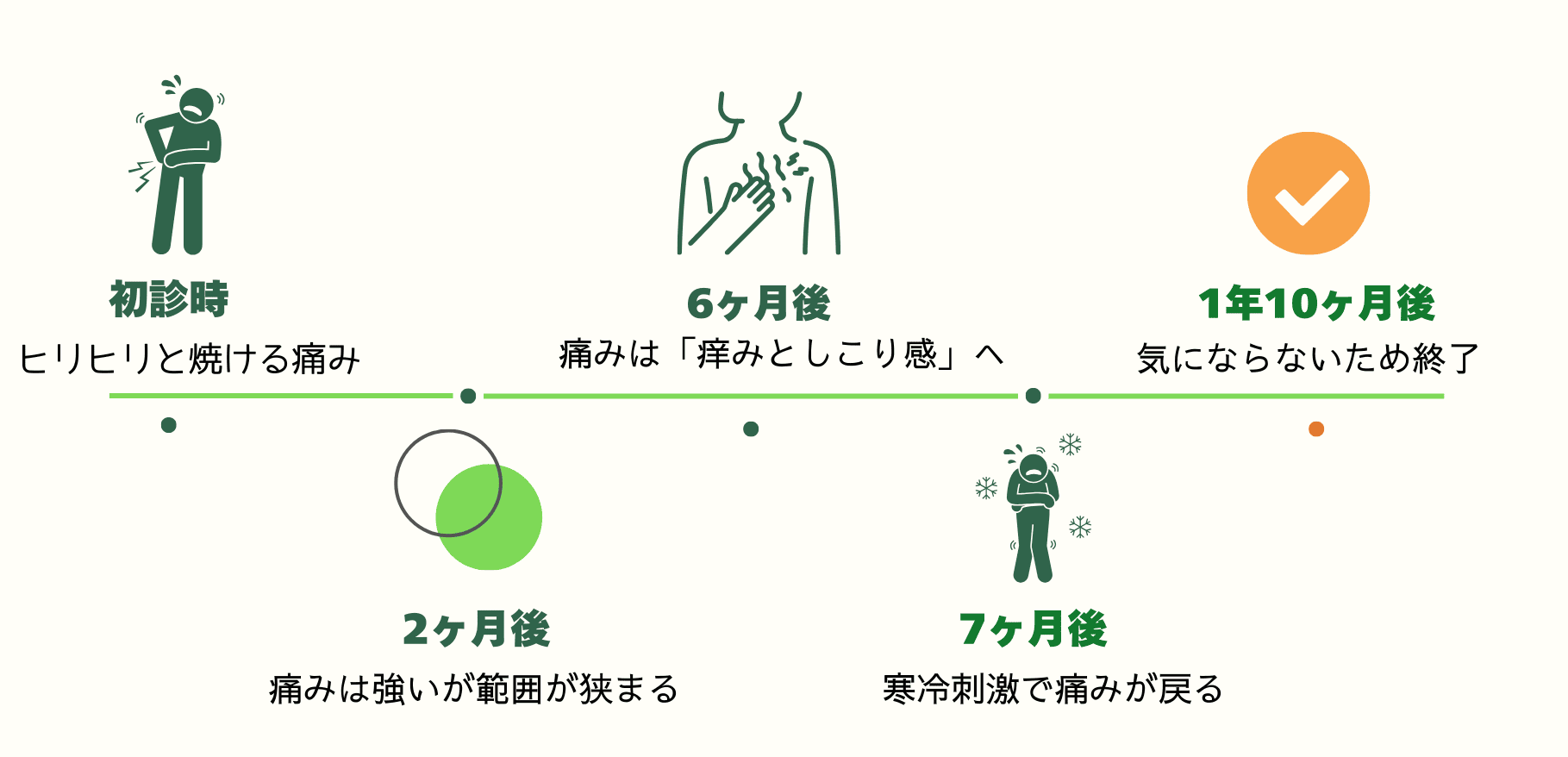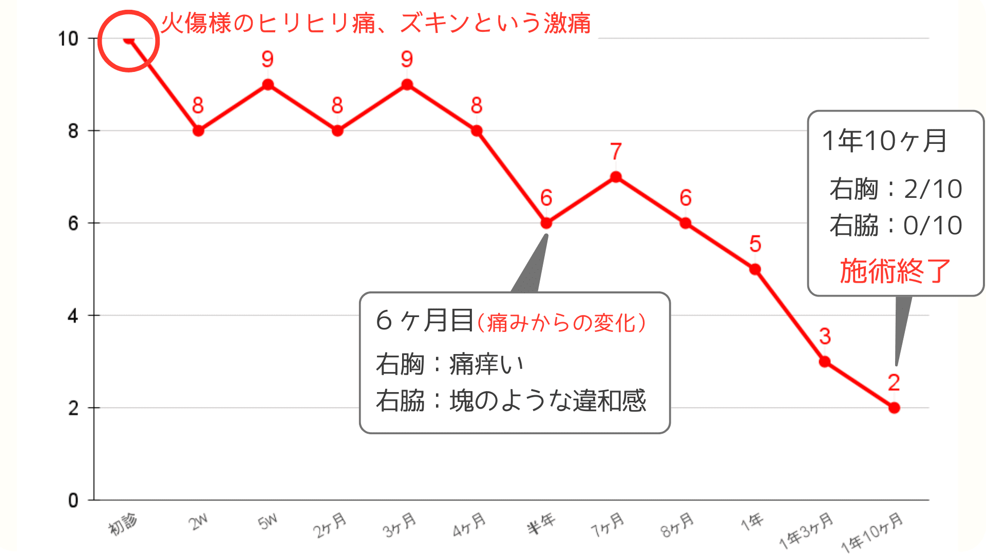 焼ける様な痛みと突然くる激痛は耐え難いものでした。施術を開始してから安定するのに半年はかかりました。