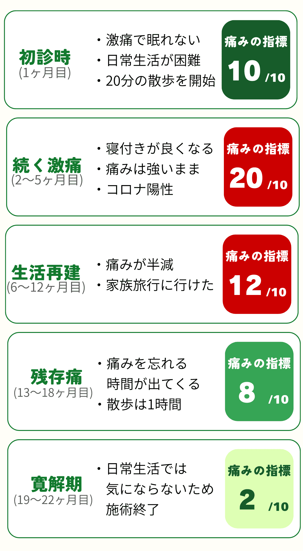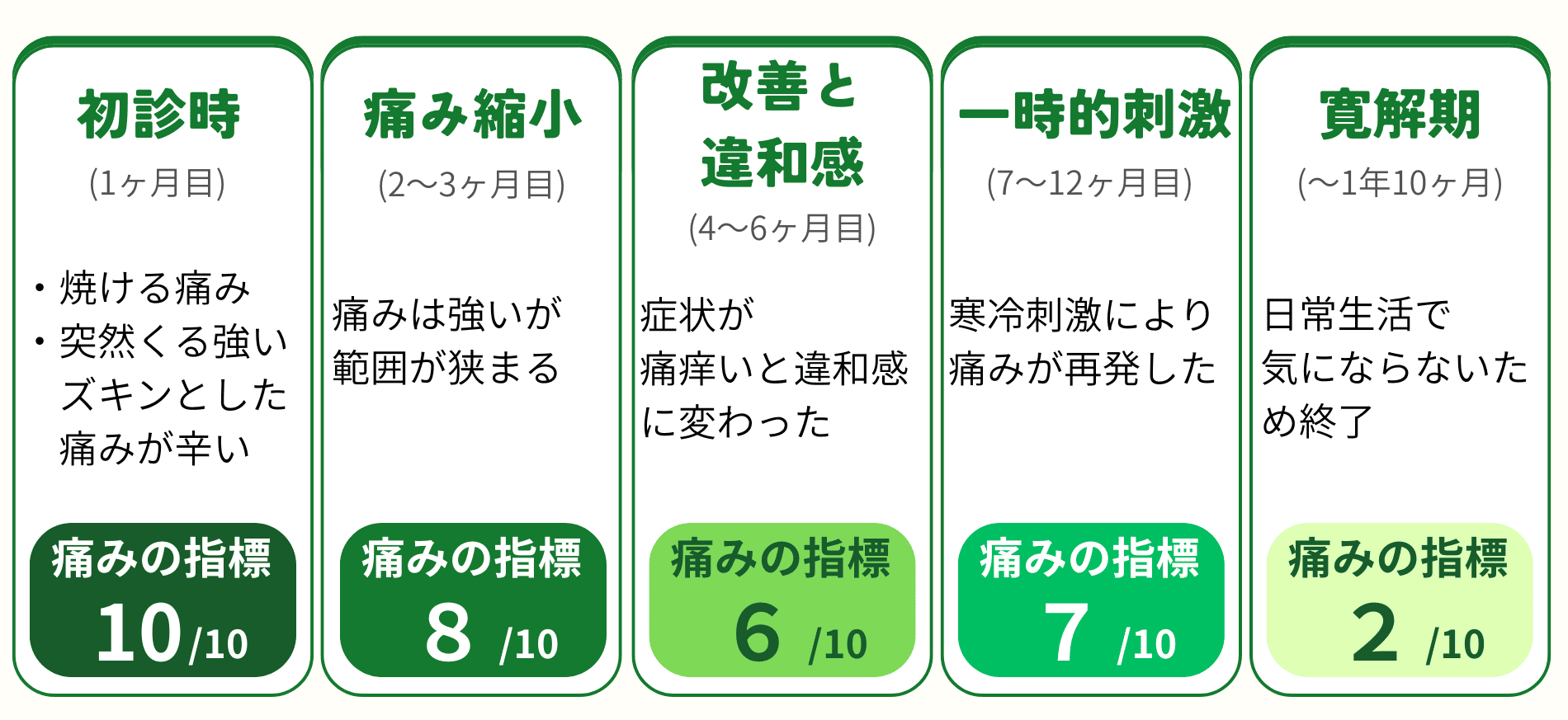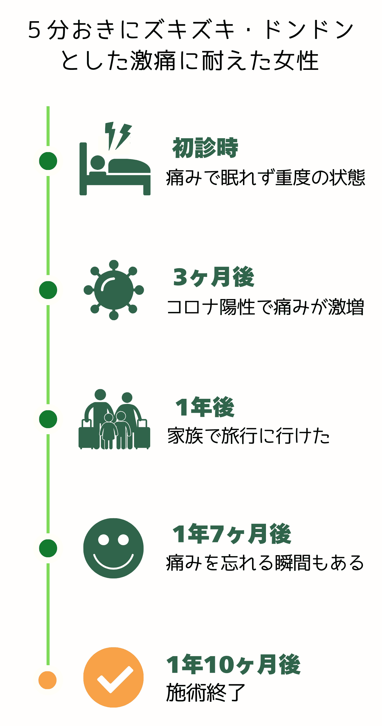 焼ける様な痛みと突然くる激痛は耐え難いものでした。施術を開始してから安定するのに半年はかかりました。