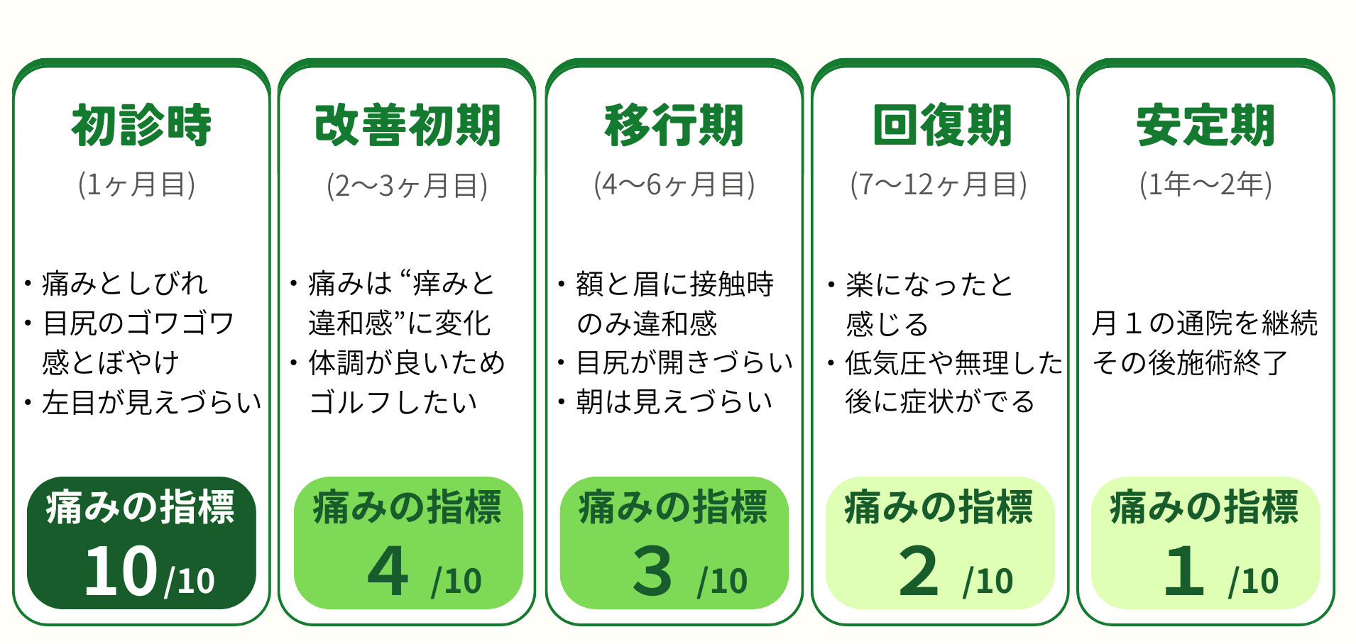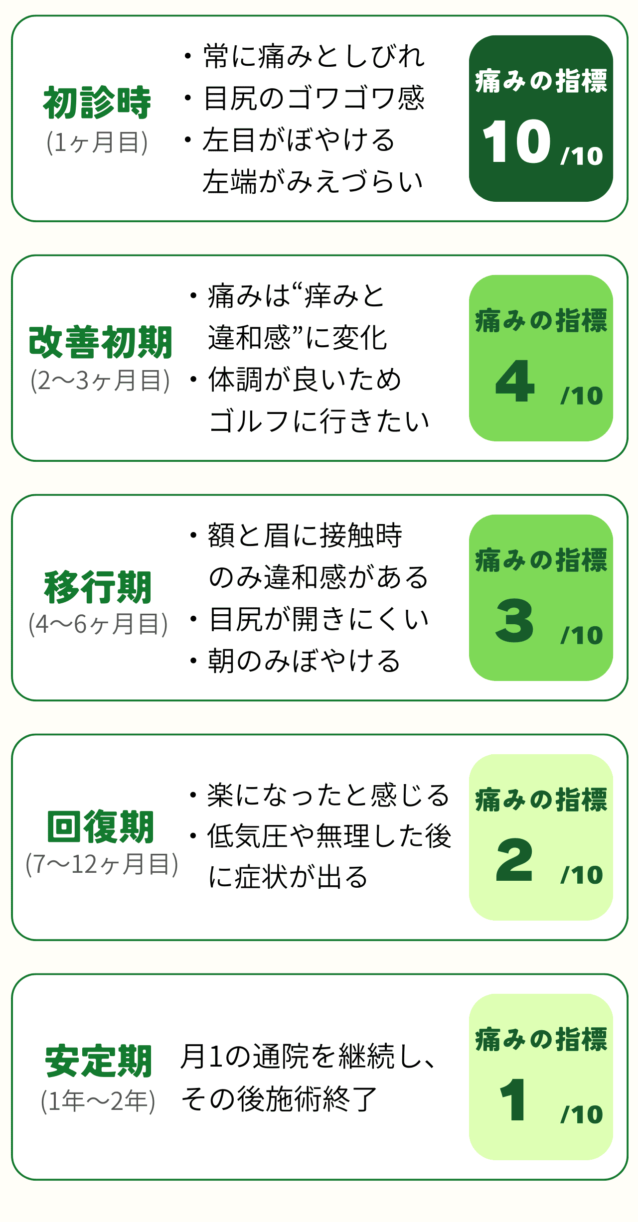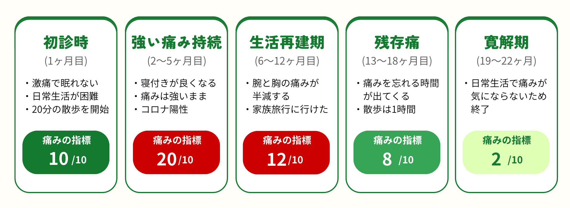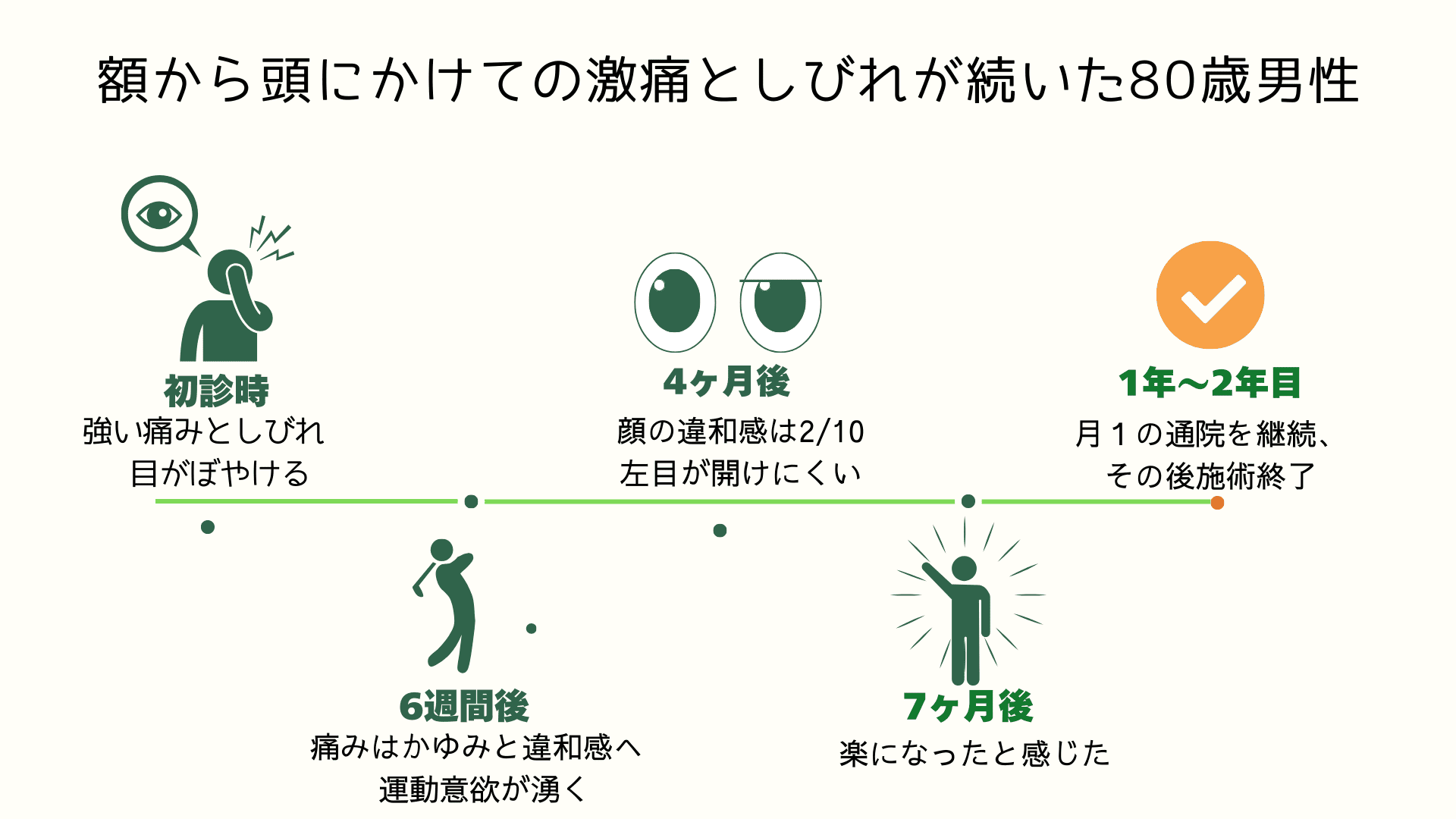 焼ける様な痛みと突然くる激痛は耐え難いものでした。施術を開始してから安定するのに半年はかかりました。